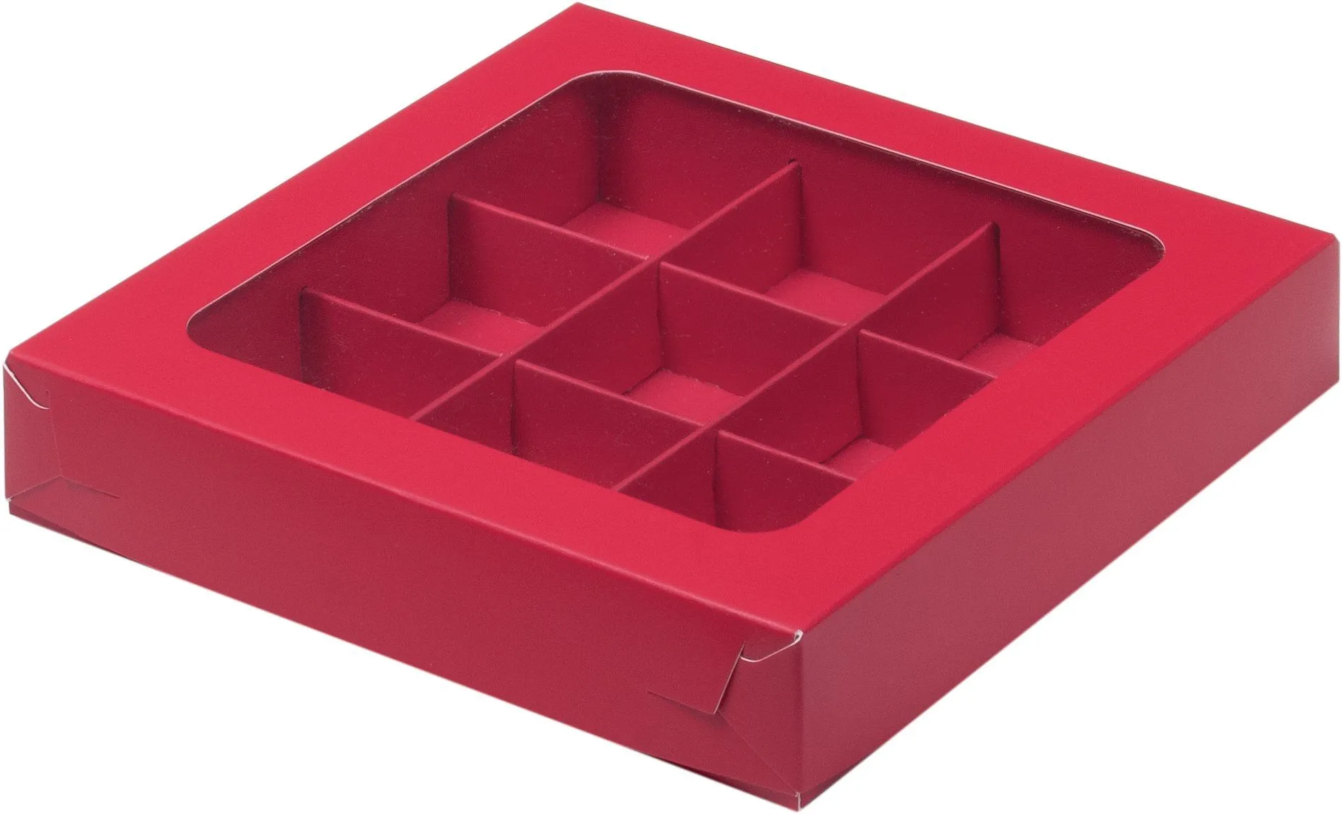 Коробка бумажная для конфет красная матовая с окном. Используют для упаковки и транспортировки конфет при доставке.