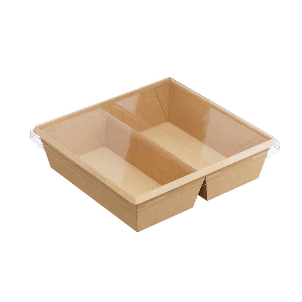 Изготовлен из прочного экологичного картона, имеет сформированный жёсткий борт (не требует сборки), крышка защёлкивается в один клик без протеканий, устойчив к конденсату, обладает высокой барьерностью (не прожиривается), подходит для разогрева в СВЧ без крышки, произведен без клея и подлежит 100% переработке.