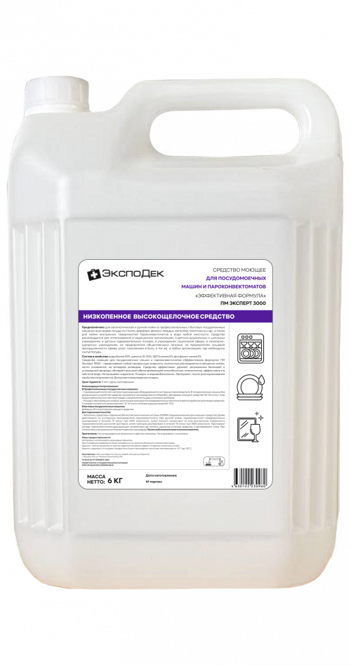 Моющее средство для ПММ и пароконвектоматов «Эффективная формула» 6 кг — щелочной концентрат для автоматической мойки посуды в профессиональных посудомоечных машинах и внутренних поверхностей пароконвектоматов. Предназначено для удаления белковых, углеводных и жировых загрязнений; низкопенное, содержит антикоррозионные добавки. Его основные преимущества: - Эффективно удаляет белковые и углеводные загрязнения, обладает высокой обезжиривающей способностью. - Низкопенное — не забивает форсунки ПММ. - Антикоррозионные добавки защищают нержавеющую сталь, пластик, стекло. - Экономичное: дозировка 0,8–1,8 мл/л воды. - Состав: щелочь 15–30%, комплексообразователи 5–15%, неионогенные ПАВ <5%, вода >30%. Рекомендуется для профессиональных посудомоечных машин всех типов, пароконвектоматов на кухнях ресторанов, кафе, столовых, пищевых производств. Разрешено к использованию в школьных и дошкольных учреждениях, в детских оздоровительных лагерях.