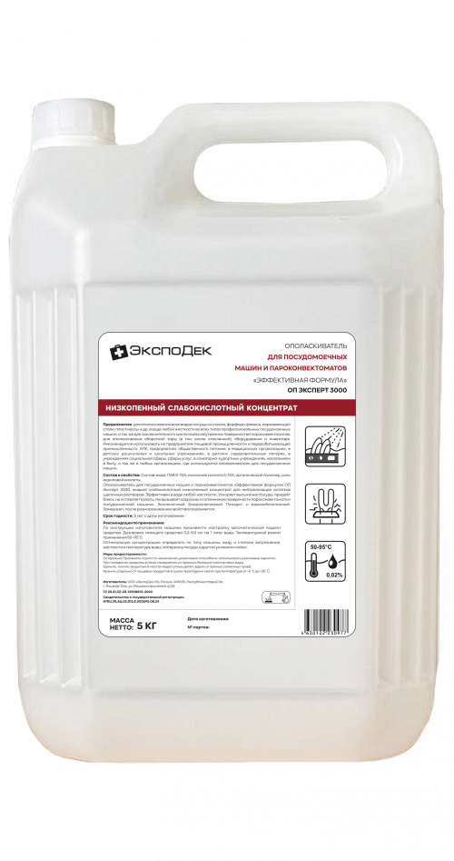 Ополаскиватель для ПММ «Эффективная формула» 5 кг — кислотный концентрат для финального ополаскивания посуды в профессиональных посудомоечных машинах и пароконвектоматах. Удаляет остатки моющего средства и накипь, обеспечивает блеск, ускоряет высыхание без пятен.