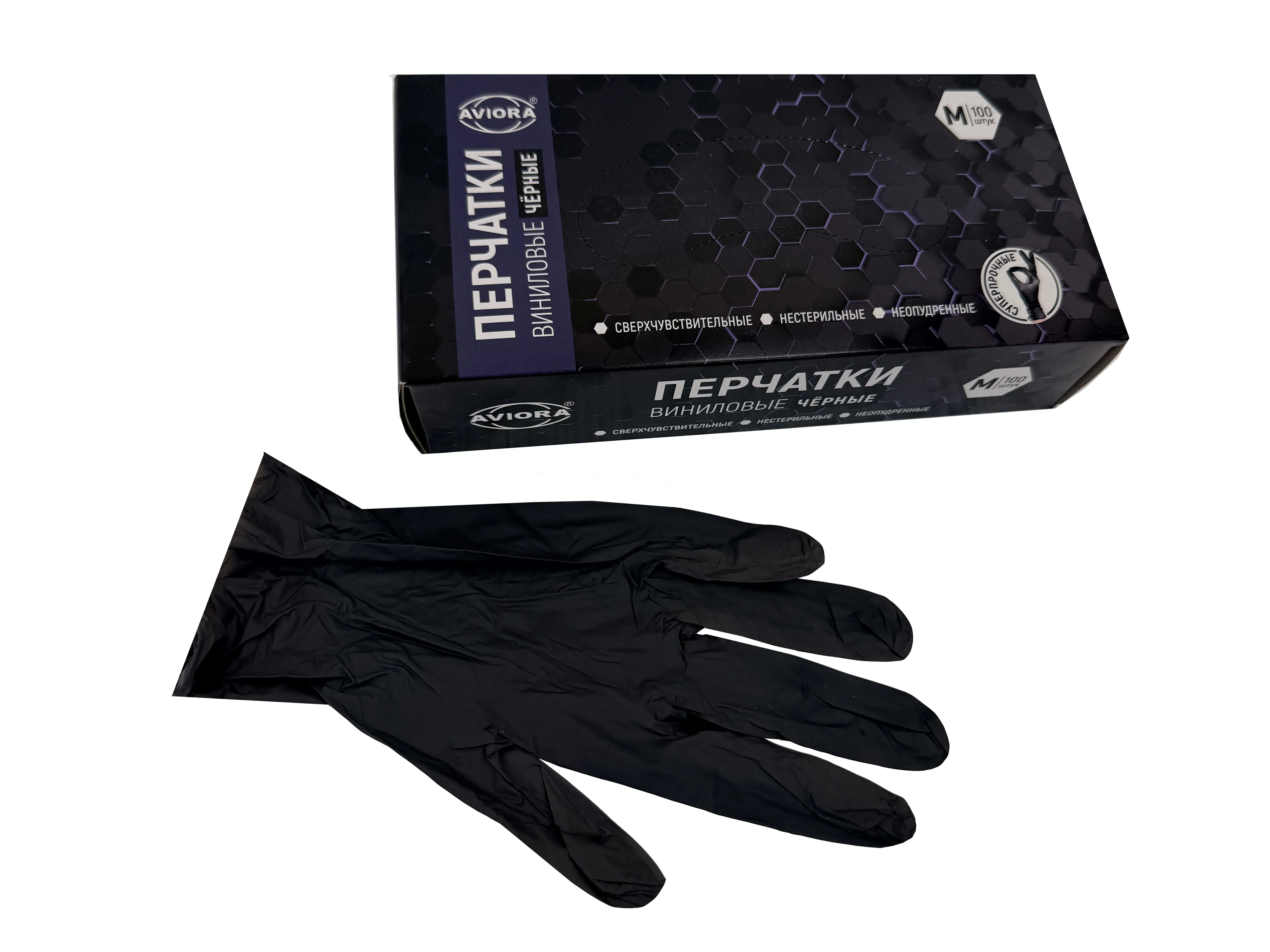 Виниловые одноразовые перчатки черного цвета. Перчатки одноразовые широко используются в медицине, в сфере красоты, в быту. Виниловые перчатки предпочтительны для использования колористами и в работе по хозяйству. Винил достаточно устойчив к активным химическим веществам, к слабым растворам кислот и к щелочам. Внутренняя поверхность перчаток - неопудренная, что снижает риск возникновения дерматита. Наличие валика, скрученного вовнутрь, препятствует скатыванию перчатки. Виниловые перчатки легко как одеваются, так и снимаются. Экран большинства смартфонов чувствителен к виниловым перчаткам, не требуется снятие перчатки для ответа на звонок или включение фотокамеры. Допускается контактировать с пищевыми продуктами. Виниловые перчатки гипоаллергенны.